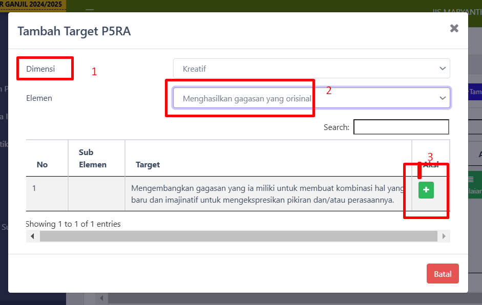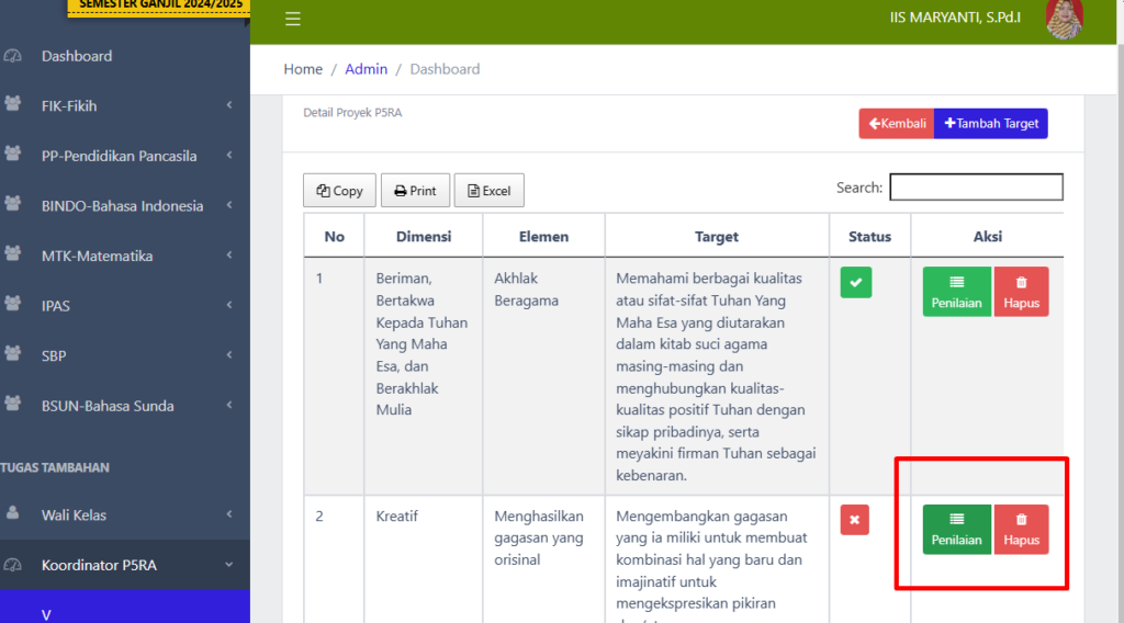 Setelah proyek berhasil ditambahkan, langkah berikutnya adalah menentukan target pembelajaran dan dimensi proyek. Proses ini bertujuan untuk mengukur pencapaian siswa dalam proyek. Berikut langkah-langkahnya: