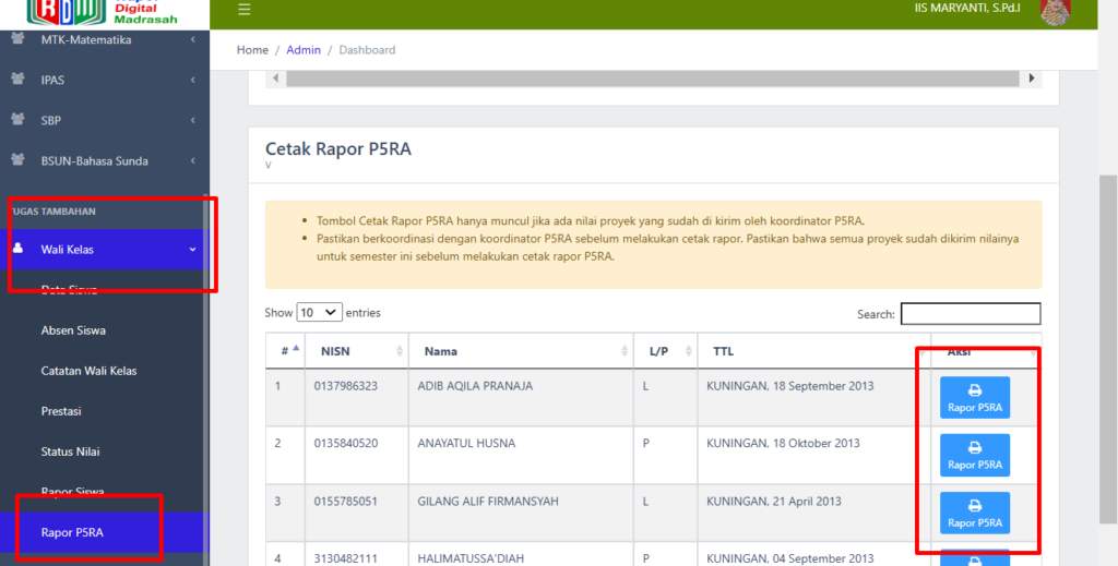 Setelah nilai dan catatan proses dikirim, langkah berikutnya adalah berkoordinasi dengan wali kelas untuk mencetak rapor P5RA. Berikut langkah-langkahnya: